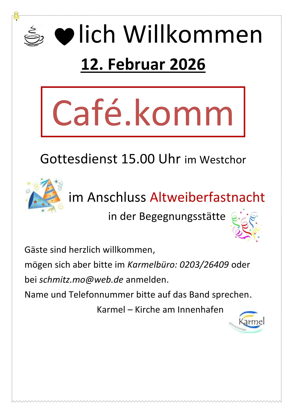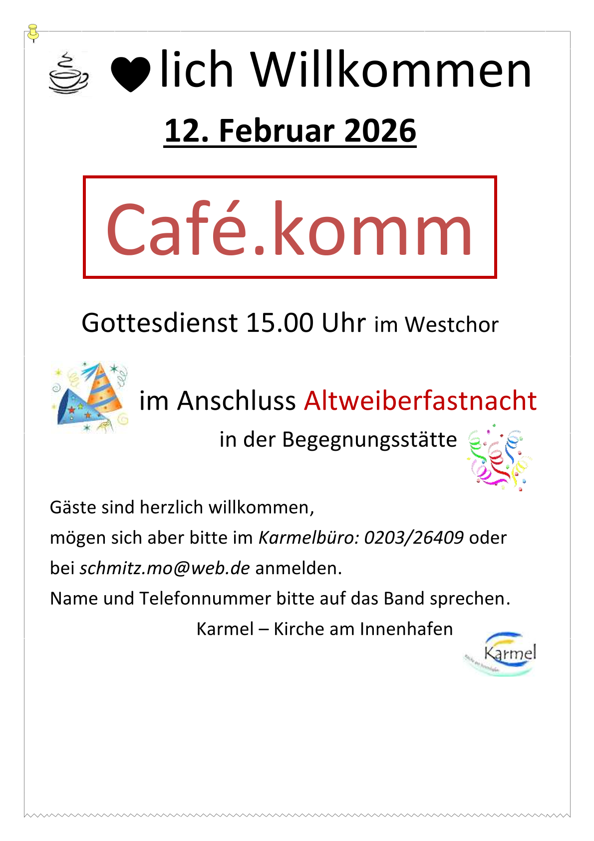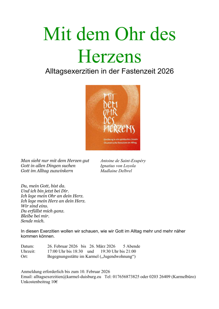 Die Mitgliederversammlung des Fördervereins findert statt am 27. Februar 2026, 19:30 Uhr. Einladungen werden rechtzeitig verschickt. Anträge können ab sofort bis zum 8. Januar 2026 eingereicht werden an den Vorstand des Fördervereins unter foerderverein@karmel-duisburg.de